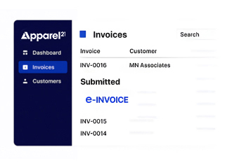 Invoice tracking is managed through dashboards providing validation results, submission responses, and real-time visibility across Apparel21 ERP environments.