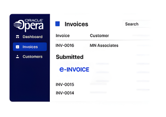 Invoice tracking is managed through dashboards providing validation results, submission responses, and real-time visibility across Opera PMS environments.