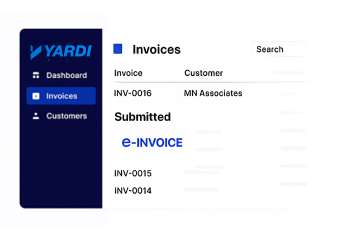 Invoice tracking is managed through dashboards providing validation results, submission responses, and real-time visibility across Yardi environments.